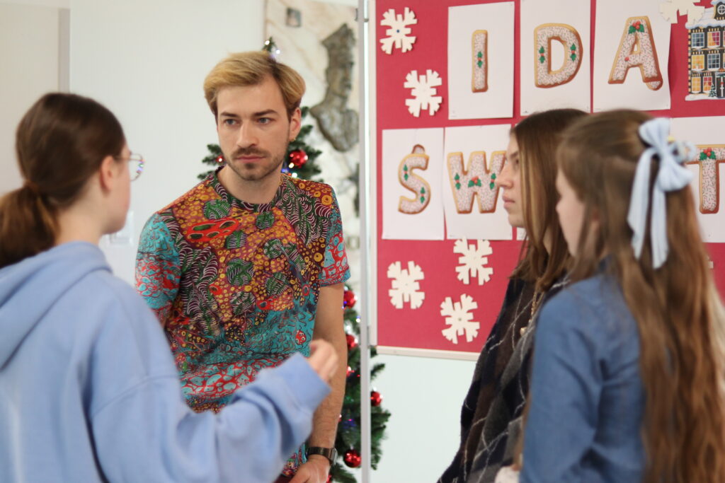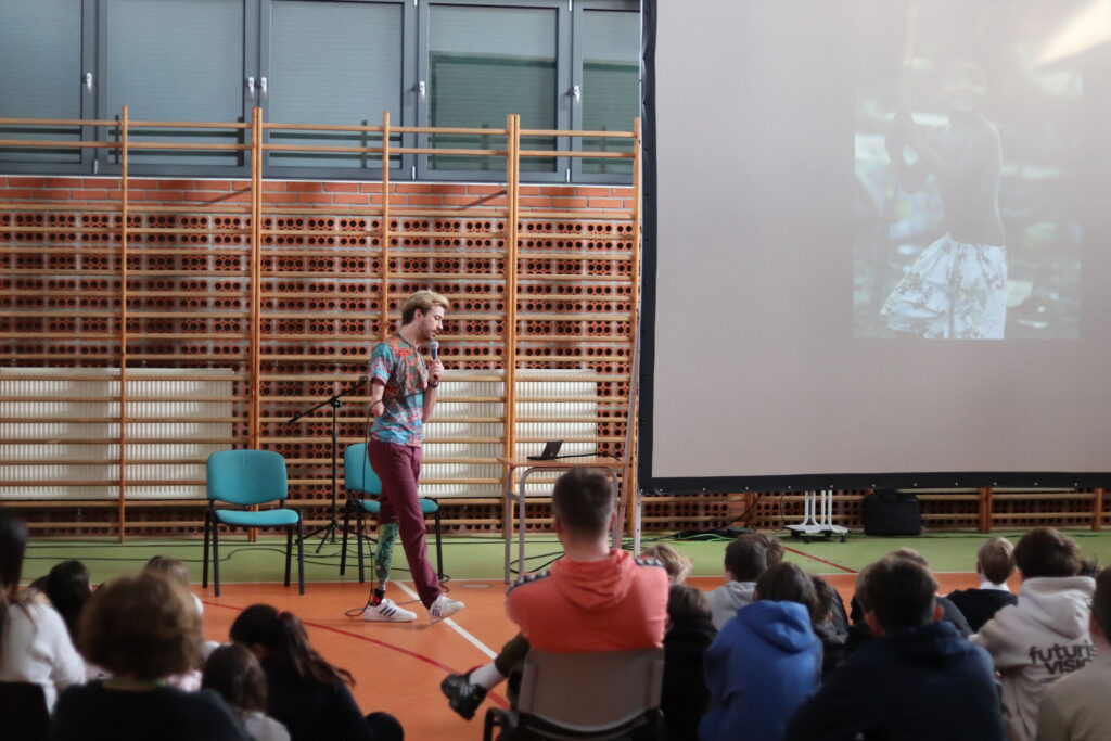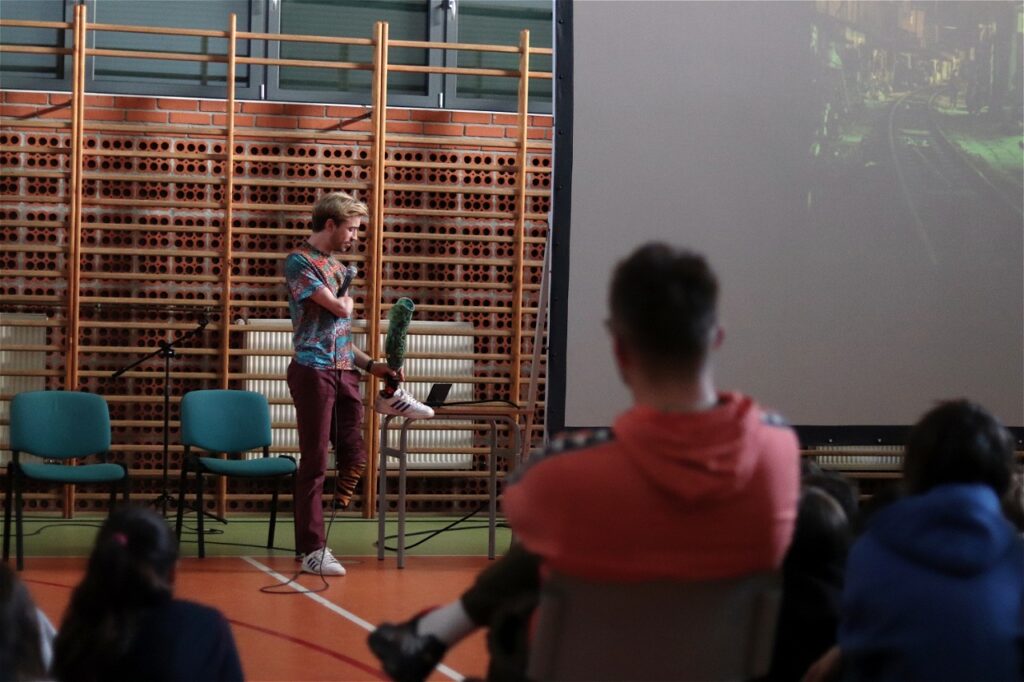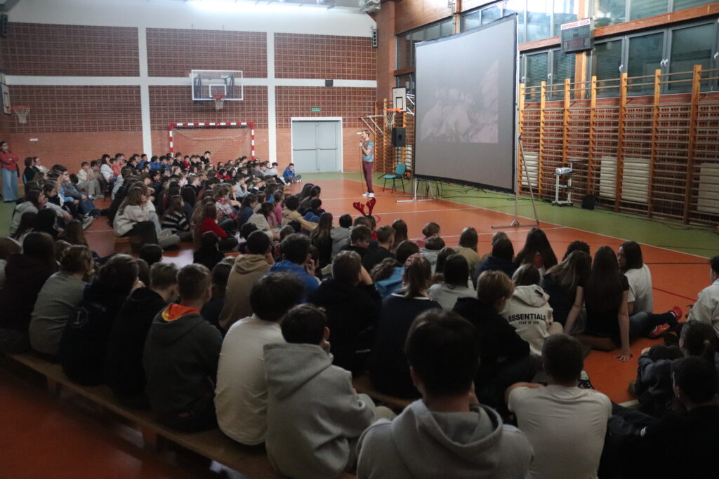 Prelekcji towarzyszyła prezentacja zdjęć z życia i wypraw Jana Meli. Spotkanie miało charakter interaktywny – uczniowie mogli zobaczyć, jak wiąże but jedną ręką, jak wygląda proteza nogi oraz usłyszeć, z jakimi wyzwaniami wiąże się codzienność osoby z niepełnosprawnością. Uczestnicy chętnie zadawali pytania. Interesowały ich m.in. języki, którymi posługuje się Jan Mela, liczba odwiedzonych krajów, osobiste doświadczenia związane z hejtem i szkołą, marzenia z dzieciństwa oraz szczegóły wyprawy na biegun. Po prelekcji uczestnicy mogli zrobić zdjęcia i otrzymać autografy od gościa. Na zakończenie Jan Mela wpisał się do księgi pamiątkowej szkoły, otrzymując w zamian pamiątkowy kubek.